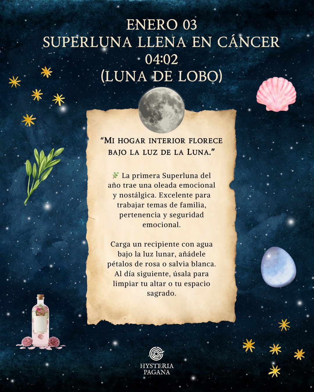 🌕Enero 03: Superluna llena en Cáncer 04:02 hrs. Es la primera superluna del año; a esta luna llena también se le llama Luna de Lobo. Nombres para el Hemisferio Sur: Luna de Heno, Luna de Venado, Luna de Trueno, Luna de Hidromiel.