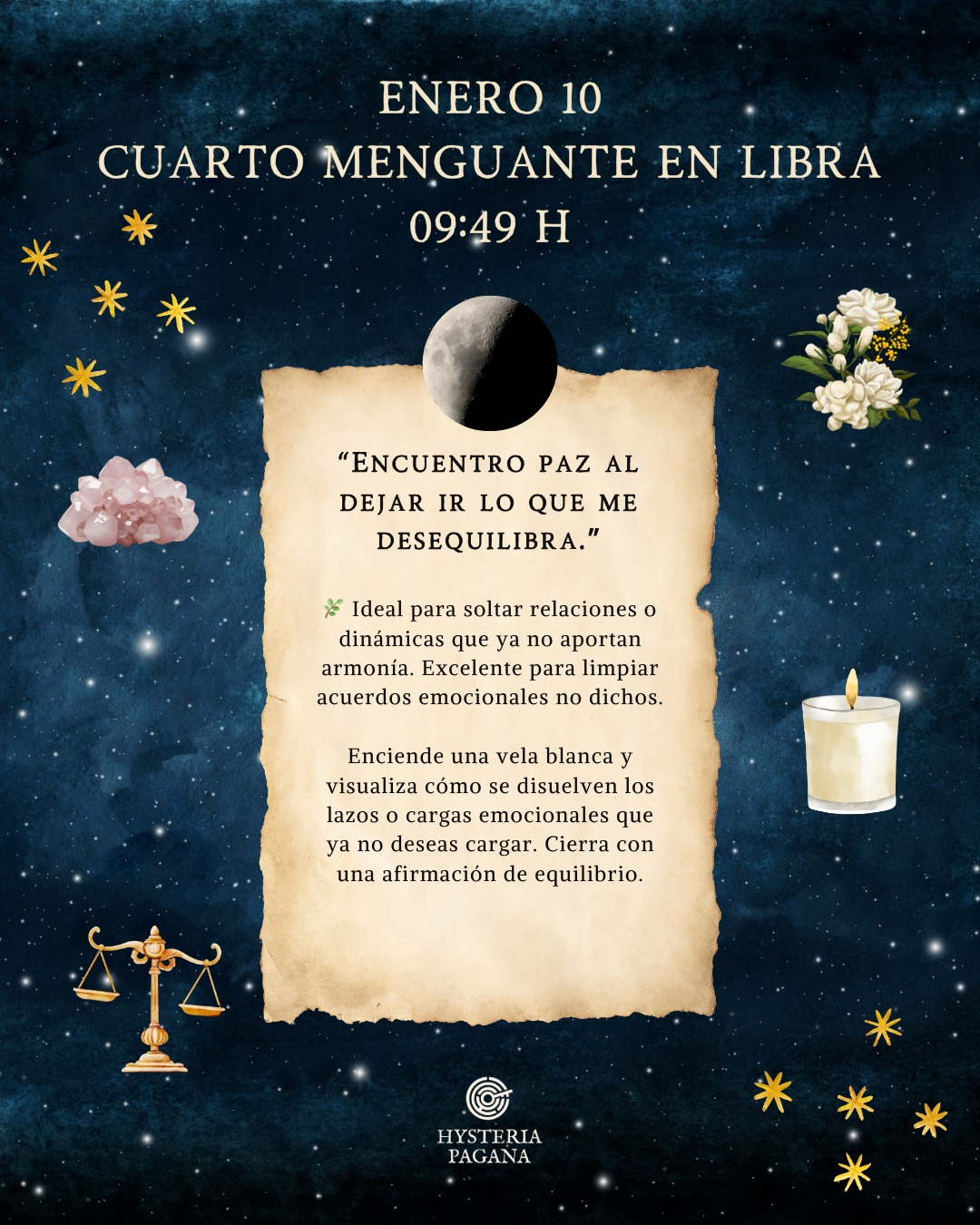 🌗Enero 10: Luna en Cuarto Menguante en Libra. La luna es a las 09:49 h.