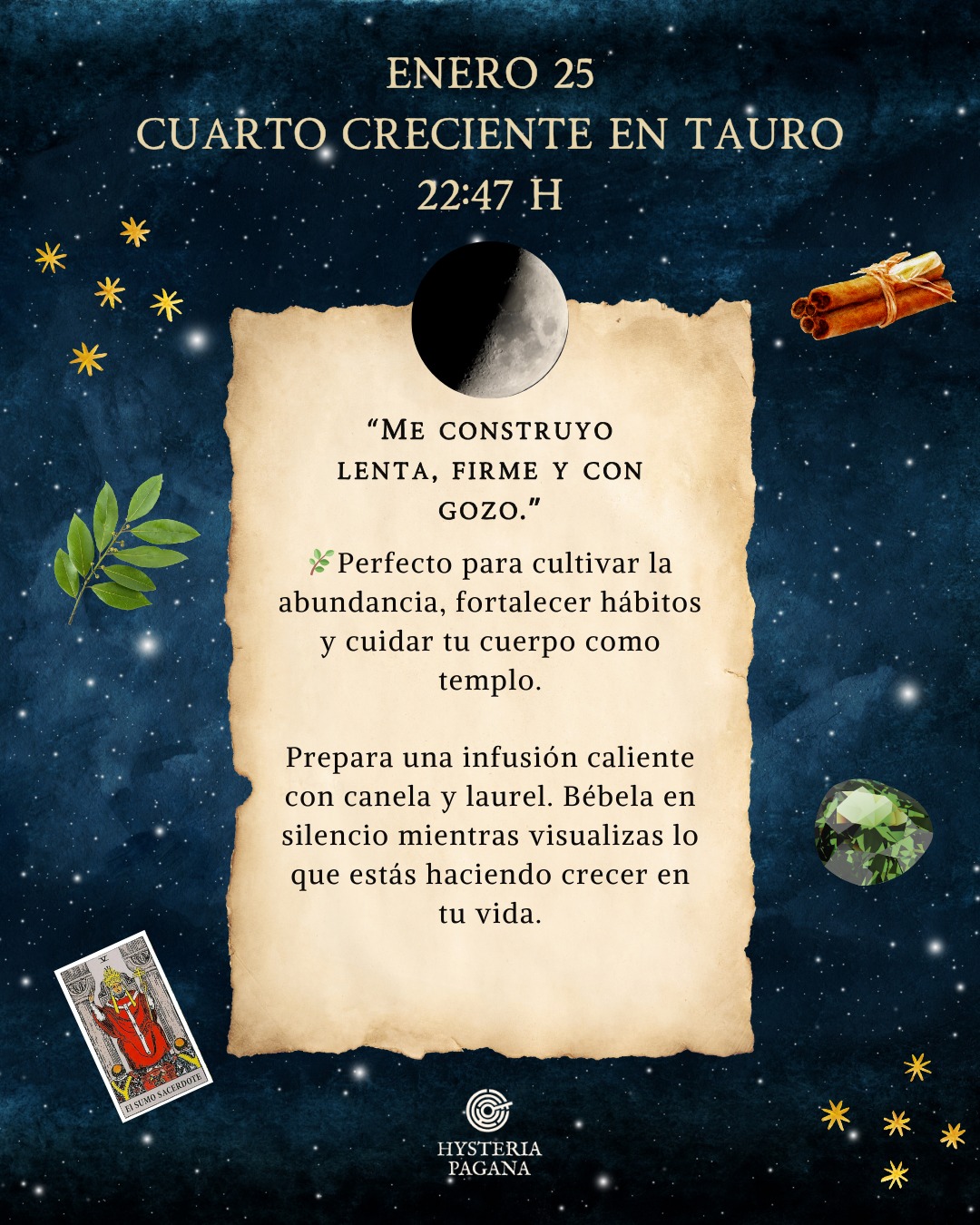 🌗Enero 25: Luna en Cuarto Creciente en Tauro. La luna es a las 22:47 h