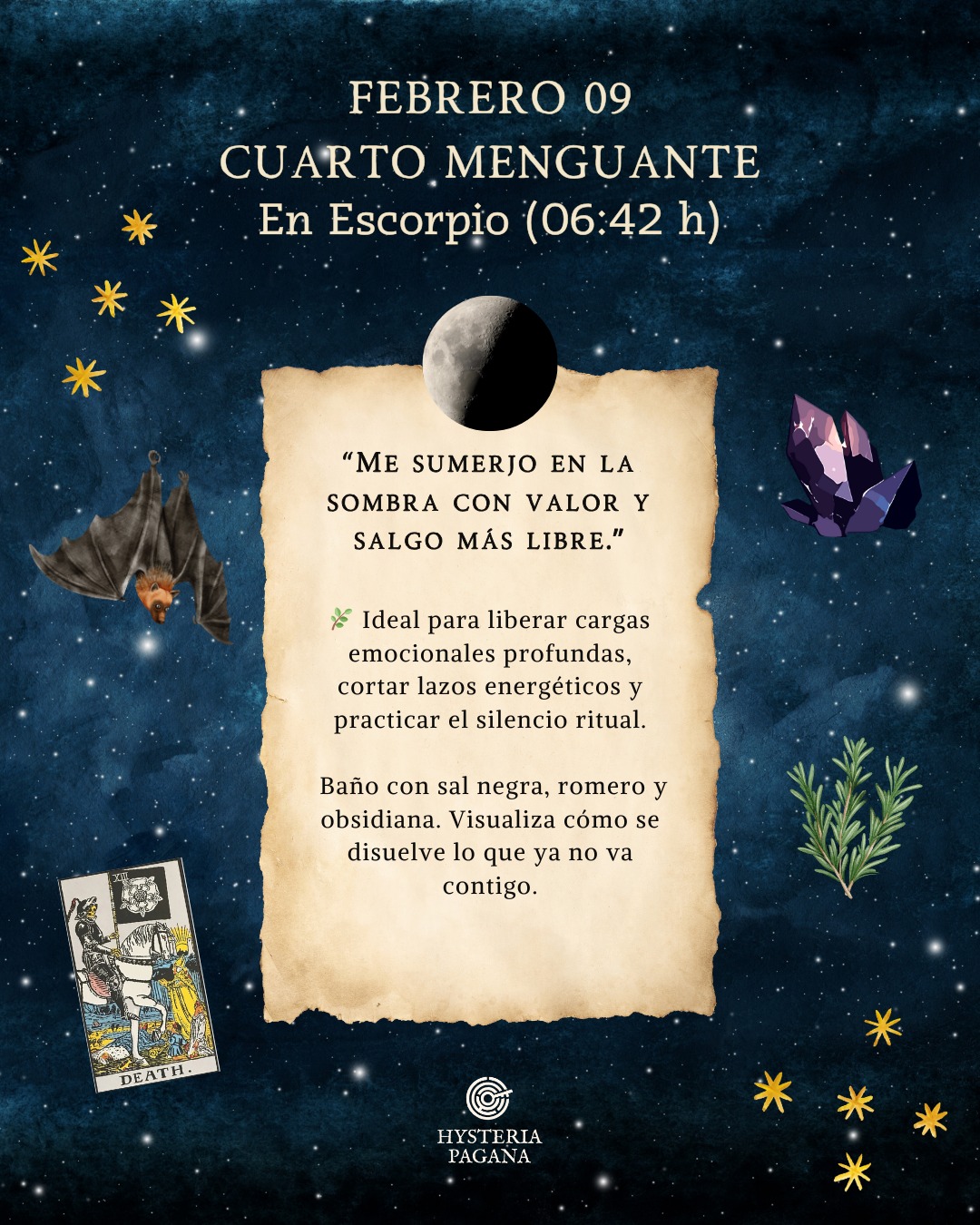 🌗Febrero 09: Luna en Cuarto Menguante en Escorpio. La luna es a las 06:42 h.